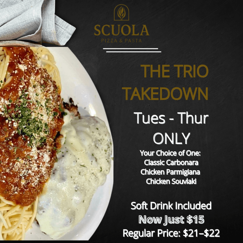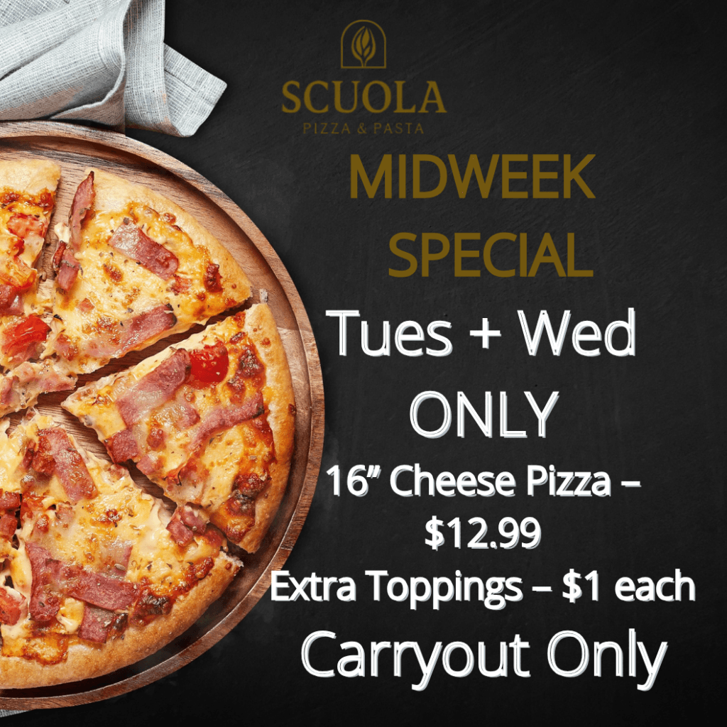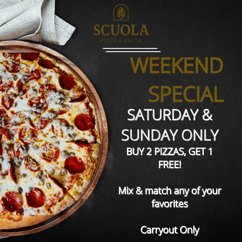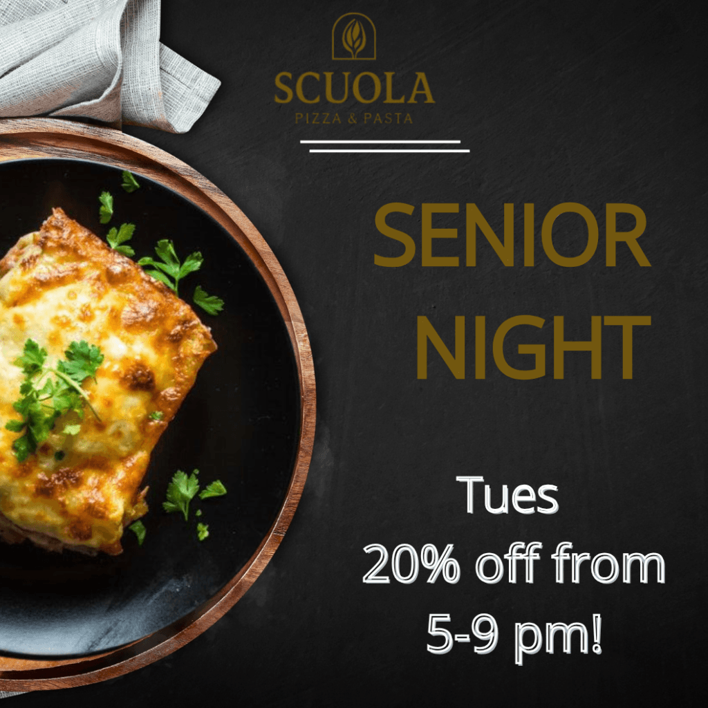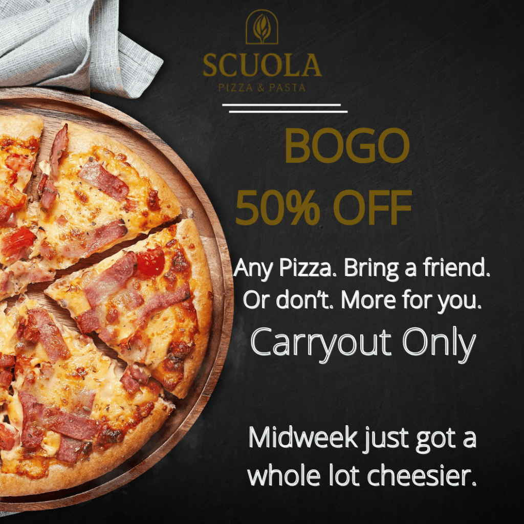 Scuola Pizza – Daily Specials ORder Now Tuesday – Senior Night 20% off for Senior Citizens Midweek Specials Tues through Thurs BOGO 50% Pizza! Sat/Sun Pizza Party Special Buy 2 pizzas Get 1 Free!