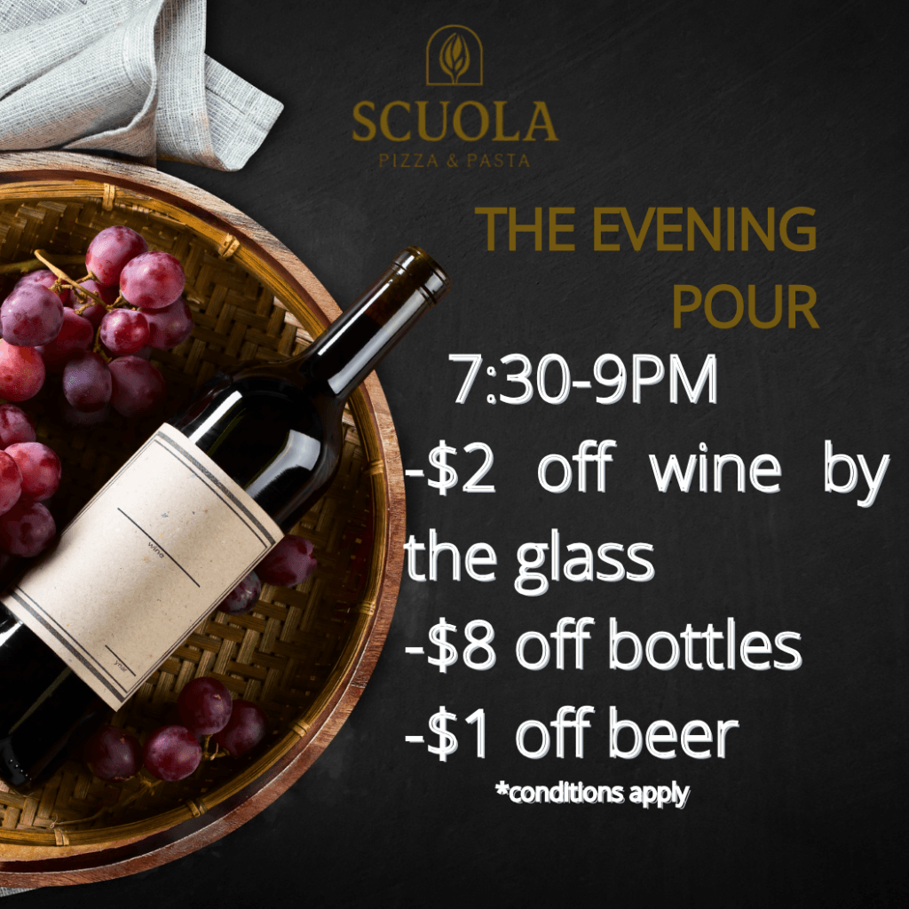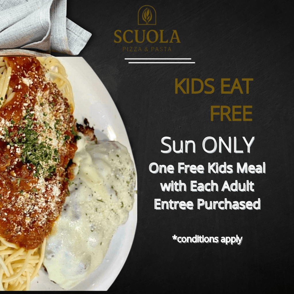 Scuola Pizza – Daily Specials ORder Now Sunday – Kids Eat Free First Responder Lunch The Evening Pour Sat/Sun Pizza Party Special Buy 2 pizzas, Get 1 Free!